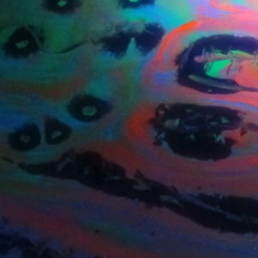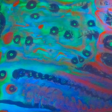 I had a lot of fun experimenting with neon and iridescent paints, BUT I have yet to master black light photography. I am exploring more iridescent and neon in my work because I love the effects you can achieve. There are 2-3 paintings in one!